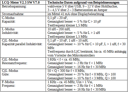 Das LCQ-Meter ist in der Lage Kapazitäten von weniger als 1 pF bis mehr als 10 nF zu vermessen. Größere Kondensatoren verhindern, wegen der dann zu geringen internen Rückkopplung, ein Anschwingen des Oszillators. Induktivitäten können von weniger als 1 µH bis mehr als 100 mH vermessen werden.